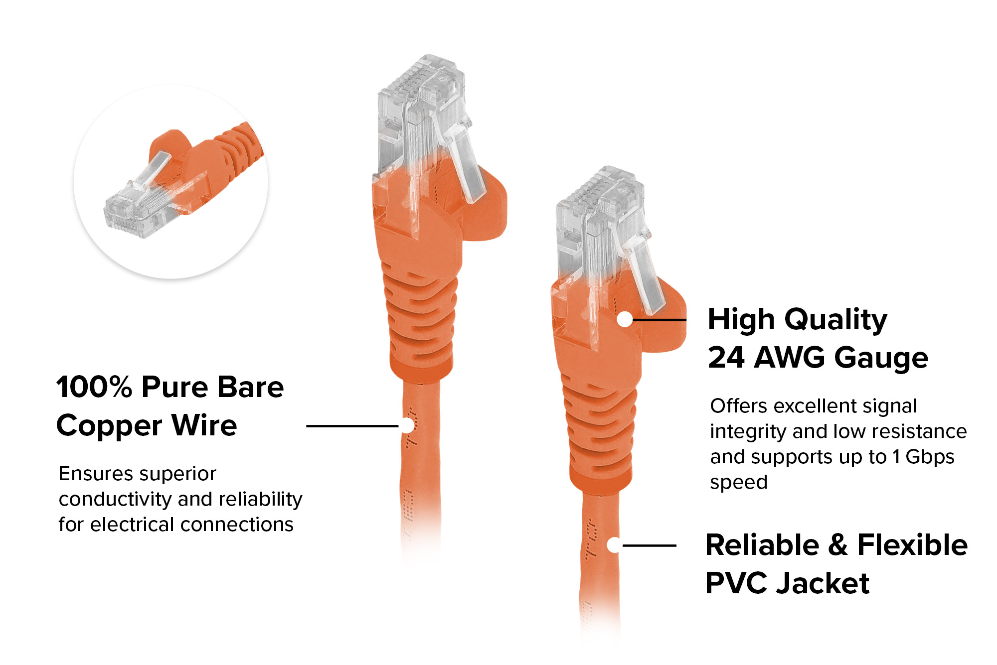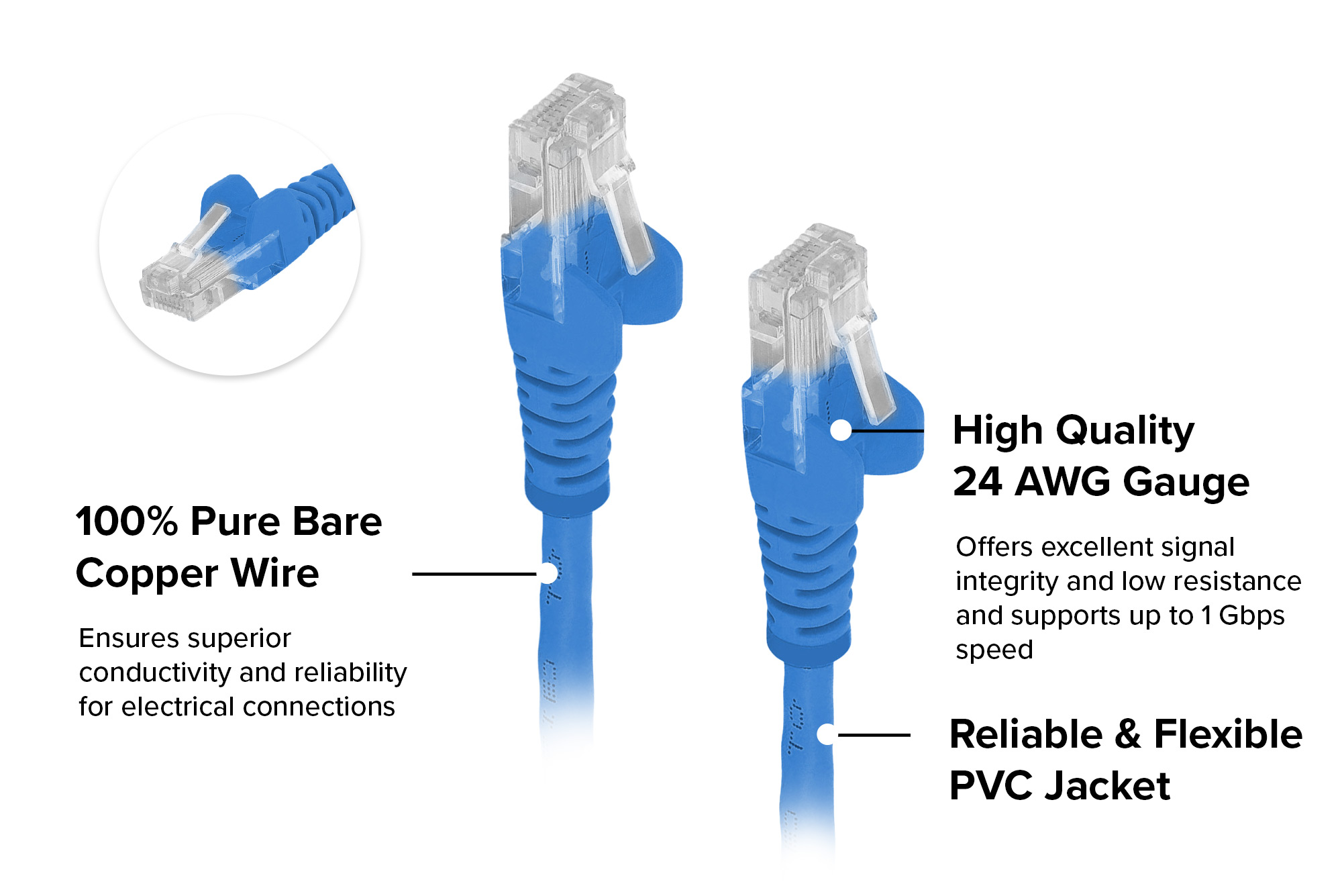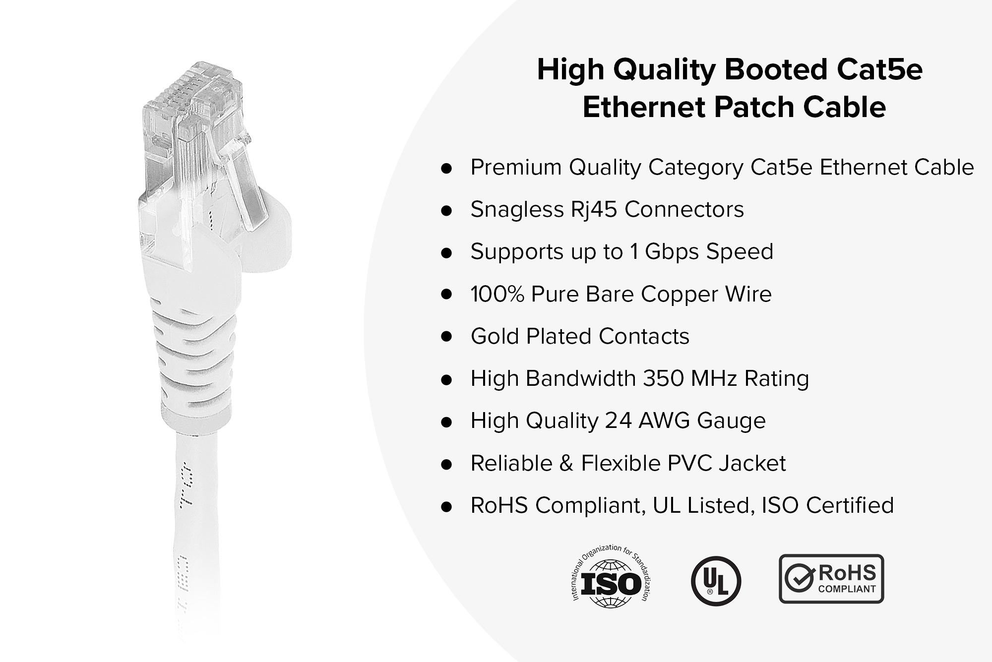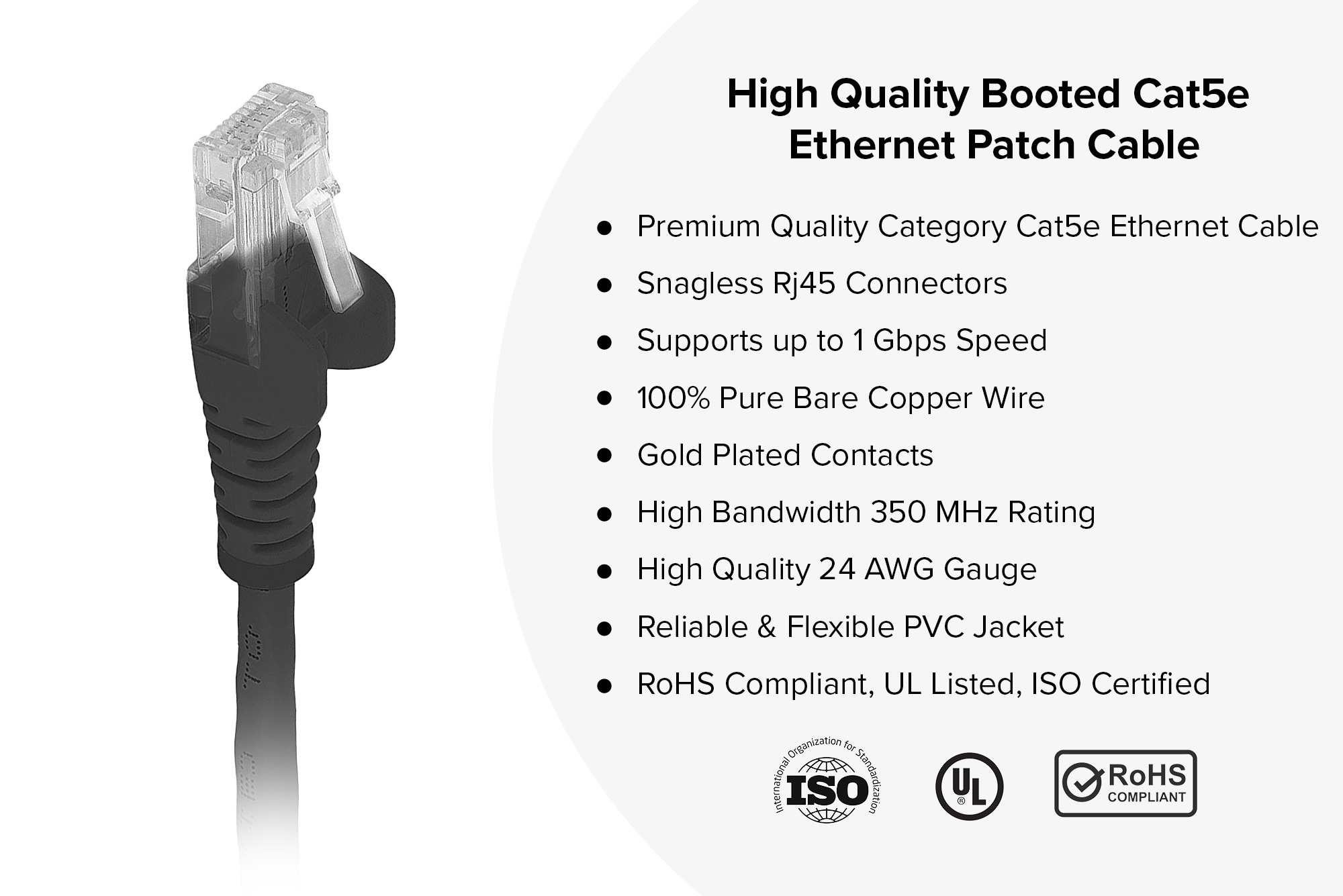 Introducing our Cat5e Ethernet patch cables, the go-to choice for both home and office networking needs. These cables effortlessly connect computers to a variety of devices, including cable modems, routers, patch panels, hubs, and switches. Featuring a standard boot with a molded bubble design, they provide protection for the connector during installation. Our Ethernet patch cables are UL-listed and meticulously tested to 350 MHz, ensuring efficient data distribution with minimal return loss for optimal network performance.