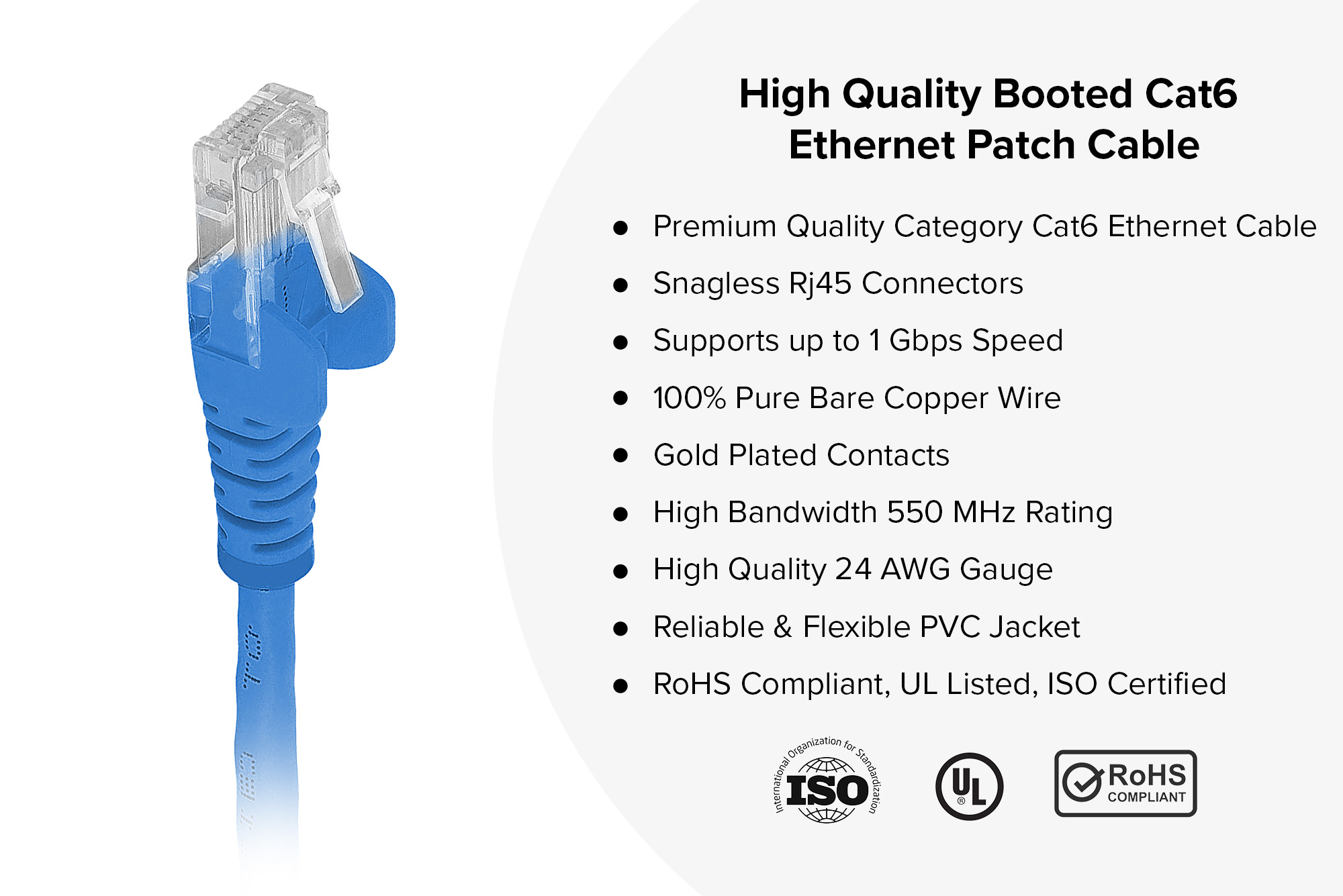 Introducing our Cat6 Ethernet patch cables, representing the next level of networking connectivity for both home and office environments. These cables effortlessly link computers to various devices, including cable modems, routers, patch panels, hubs, and switches. Cat6 offers backward compatibility with Cat5e, making it suitable for replacing any standard Cat5e networking cable. Featuring a standard boot with a molded bubble design, these cables safeguard the connector from potential damage during installation. Our Ethernet patch cables are UL-listed and meticulously tested to 550 MHz, ensuring efficient data distribution with minimal return loss for superior network performance.