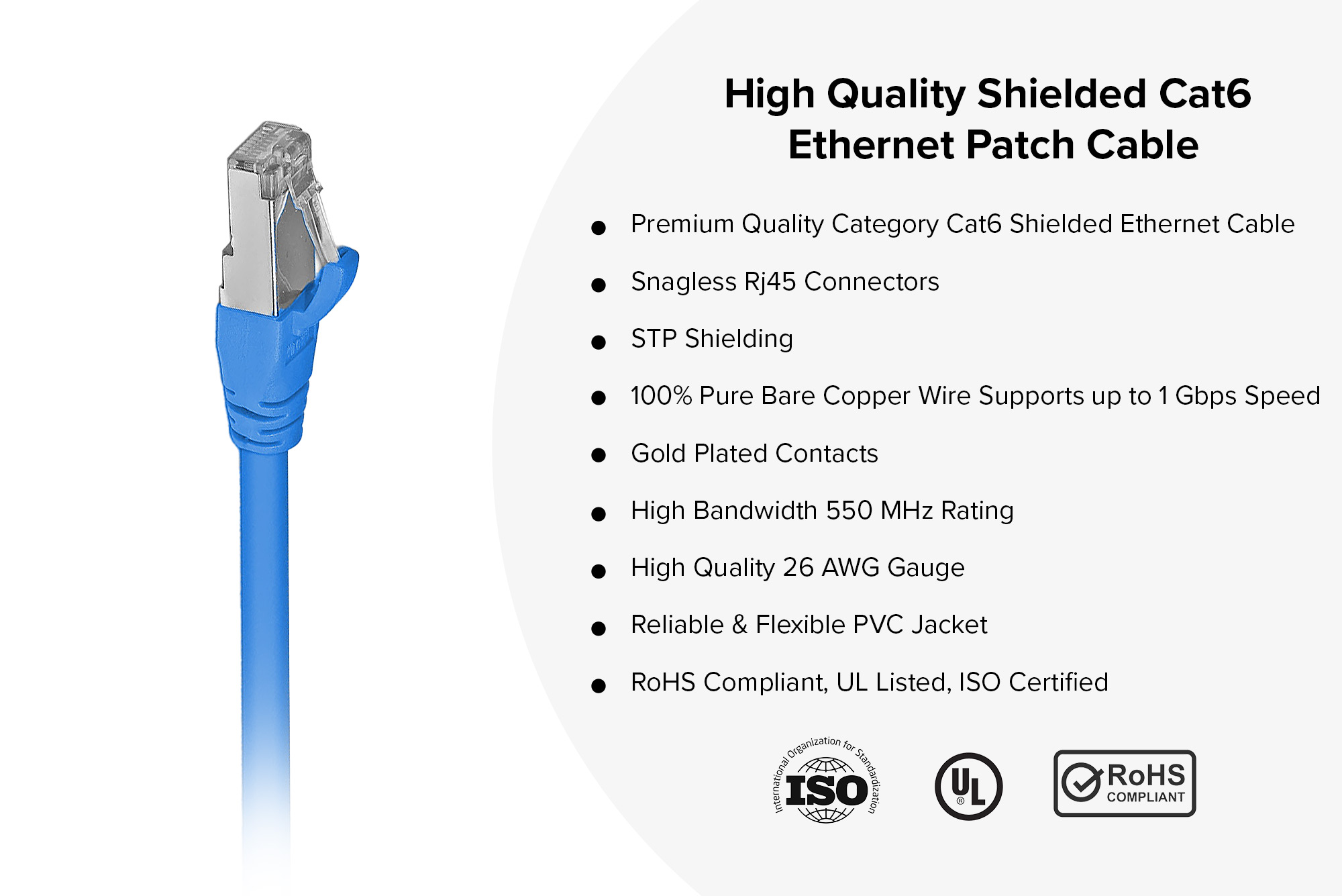 Introducing our shielded Cat6 patch cables, tailored network cables engineered to provide robust defense against EMI interference commonly encountered in proximity to power sources. To fully leverage the advantages of shielded patch cables, it's essential to shield your entire network infrastructure. These cables commonly link computers to various devices, including cable modems, routers, patch panels, hubs, and switches. Equipped with a molded boot for safeguarding the connector during installation, shielded twisted pair construction effectively mitigates crosstalk, ensuring seamless data transmission. With an ample bandwidth of 550 MHz, these cables efficiently distribute data with minimal return loss, guaranteeing superior network performance.